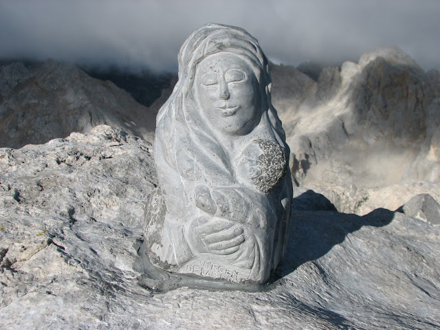 Permanecemos unos minutos en la cumbre mientras hacemos fotos, termino de rodar unos planos y disfrutamos de las vistas. Nos preguntamos qué ha sido de la pequeña vírgen que coronaba la montaña, y Álvaro nos dice que por tres o cuatro veces la han derribado o robado. Parece que a algunos no les resulta «apropiado» tener un símbolo religioso en la cumbre de «su» montaña. No es que ninguno de los tres seamos muy religiosos, pero esta virgencita era ya un simbolo del Picu y tirarla por intereses personales nos parece mal.